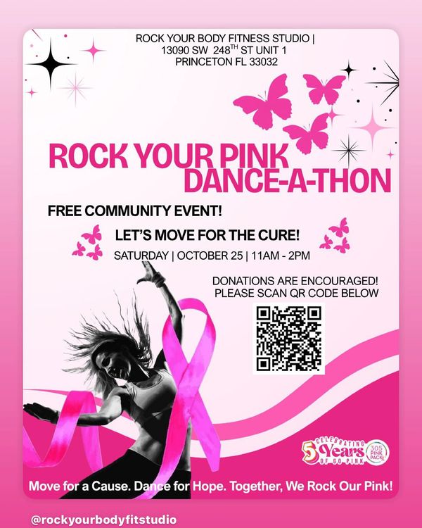 Join us for our first-ever FREE Dance-A-Thon to raise awareness and support for women battling breast cancer. We’ve partnered with 305pinkpack, a local nonprofit helping women in South Florida. Wear PINK, bring friends & family, and let’s dance for a cause that matters! Even if you can’t attend, please help by sharing the flyer and asking your employer, family & friends to donate here: